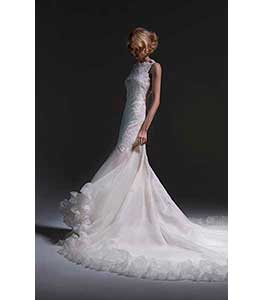 Abito da sposa in pizzo macramè con gonna in organza decorata da rouches